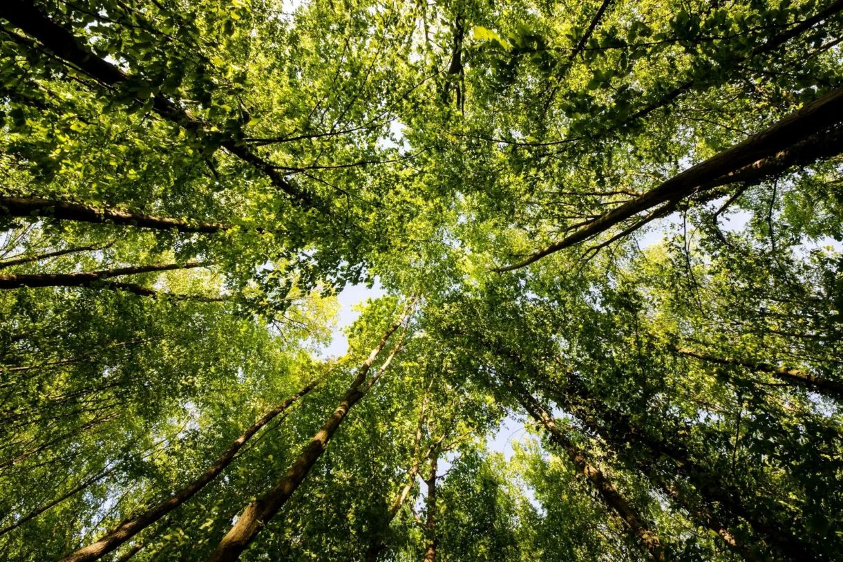 A view of the tops of trees from below.